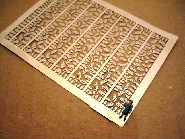 Manche Pflanzen lassen sich im Modell mit den üblichen Mitteln nicht nachbilden. Also muss etwas anderes her: Die Ätztechnik, vornehmlich zum Herstellen von Elekronikplatinen verwendet, kann man auch prima nutzen, um feinste Strukturen im Maßstab 1:160 herzustellen. Das Bild zeigt eine geätzte Platine von Farn im Maßstab 1:160. Die Blätter wurden am PC fein säuberlich nach Fotovorlagen nachgemalert und als Druckvorlage vorbereitet. VorbereitungDie Farnpflanzen bestehen aus 0,2 Millimeter starkem Neusilberblech und haben scharfe Kanten. Man muss aufpassen, dass man sich nicht an den spitzen Enden verletzt oder mit Kleidungsstücken hängen bleibt. Die Modelle sind nicht für Kinder geeignet. Vor dem Anmalen sollte man die Platine entfetten, damit die Farbe besser haftet. Dazu eignet sich warmes Wasser mit einem Tropfen Spülmittel. Gut trocknen lassen. Anschließend nur noch den Rahmen anfassen, die Modelle selbst nicht mehr mit den Fingern berühren. Anmalen und montierenMan sollte die Pflanzen noch in der Platine anmalen. Hellgrüne Farbe kommt dem Farn am nahesten, es gibt von Revell sogar einen Farbton farngrün. Der passt prima. Man sollte die Farben etwas verdünnen, damit die feinen Strukturen nicht mit Farbe zulaufen. Eventuell ein zweites Mal streichen. Wenn die Farbe trocken ist, trennt man die Blätter einzeln oder gruppenweise aus dem Ätzrahmen und biegt sie ganz leicht in ihre typische, leicht geschwungene Form. Nicht mehrmals hin und her biegen, sonst brechen die Teile möglicherweise ab. Dann kann man die Blattgruppen der Größe nach ineinander setzen und nach Belieben mit einzelnen Blättern ergänzen. Mit Sekundenkleber geht das recht einfach. Nach Fertigstellung eines Farnbusches sollte man eventuell sichtbare Glanzstellen vom Kleber mit grüner Farbe übermalen. TippsNeusilber rostet nicht und ist relativ unempfindlich gegen Feuchtigkeit. Trotzdem sollte man die Pflanzen nicht direkt in Modellgips pflanzen, da nicht vorherzusehen ist, ob es nicht doch eine unerwünschte chemische Reaktion gibt. Lieber die Landschaftshaut trocknen lassen und dann bepflanzen. Man braucht: