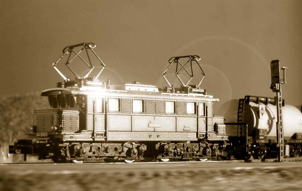Modell von MinitrixDas Modell wurde in den 60er Jahren konstruiert und hat inzwischen zwei mal eine Modellpflege erhalten. In den 90er Jahren wurde der Dachaufbau modernisiert und der unsägliche rote Schiebeschalter zur Umschaltung aud Oberleitungsbetrieb verschwand; das Dach ist jetzt deutlich besser detailliert. Leider sind die Dachleitungen unverändert statt aus dünnem Draht aus recht dicken Kunststoffrohren nachgebildet. Vorbildentsprechend ist die Pufferbohle mit dem Drehgestell (statt wie sonst mit dem Lokkasten) verbunden. Die Zugkraft ist durchschnittlich, der dreipolige Motor läuft knurrig, aber rund, wenn er erst mal in Bewegung ist. Die neueste Modellvariante hat einen aktuellen Motor und eine Digitalschnittstelle. Man muss also bei Kauf genau hingucken, welche Version man erwischt. |