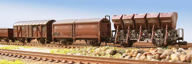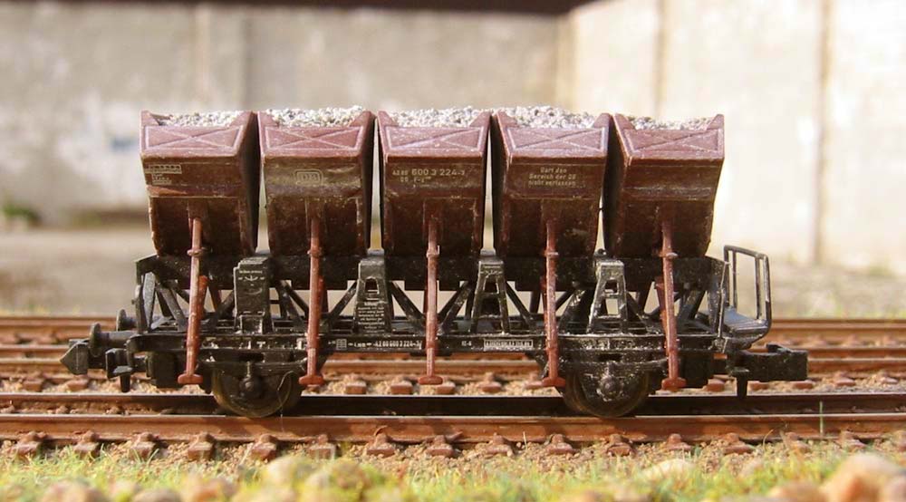 Güterzug Begleitwagen Pwghs 054, wie er aus der Schachtel kommt Der Packwagen bekommt seine Betriebsspuren mit schwarzer, hell- und dunkelbrauner Pulverfarbe, vor allem an den stellen, an denen sich Schmutz ansammelt: Streben, das Lager der Schiebetür, Griffe, Bremserbühne, Dach, Einstieg. Das Ganze wird mit Mattlack fixiert, um den Wagen griffest zu machen. |