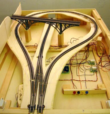 Zudem wird der Wender zu einem betriebsintensiven Modul. Neben dem Wender gibt es einen eingleisigen Abzweig, der zu einem Schattenbahnhof oder einem eingleisigen Modul führt. Eine Stahlbrücke mit einer eingleisigen Strecke verdeckt die Wendeschleife zusätzlich und schafft einen zusätzlichen Hingucker, denn auf dem Gleisstück kann man dekorativ eine Zuggarnitur platzieren; es bleibt funktionslos. |